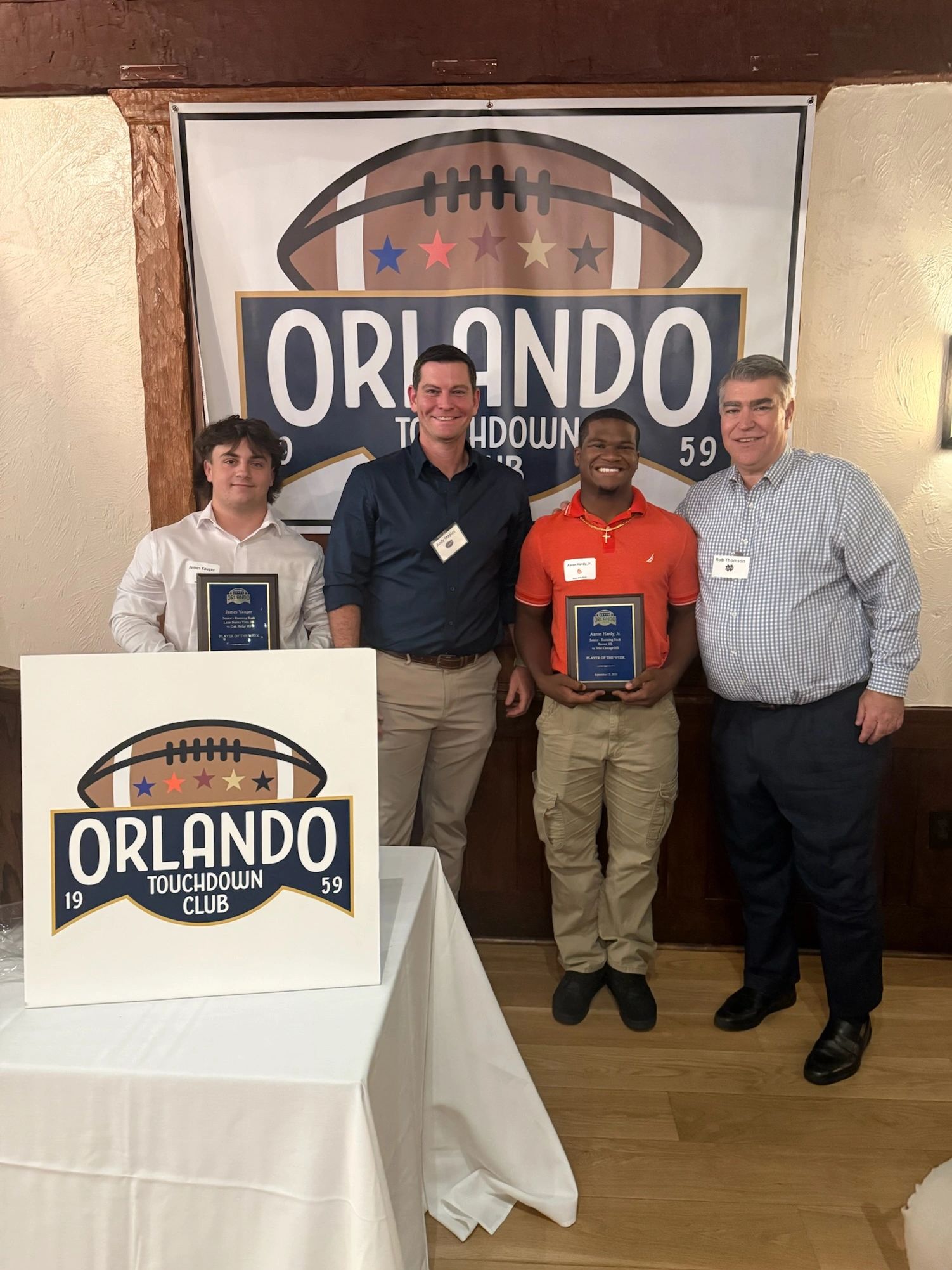 The Orlando Touchdown Club recognizes Curtis Dewberry, III, Sr. "Athlete," Lake Brantley High School, Ayden Pouncey, Sr. Safety, Winter Park High School, Damian Moore, Sr. Athlete, Edgewater High School, Jiah Walls, Sr. Linebacker, Evans High School. Dan LeForest and Chris Doering presented them with plaques to memorialize the honor!
