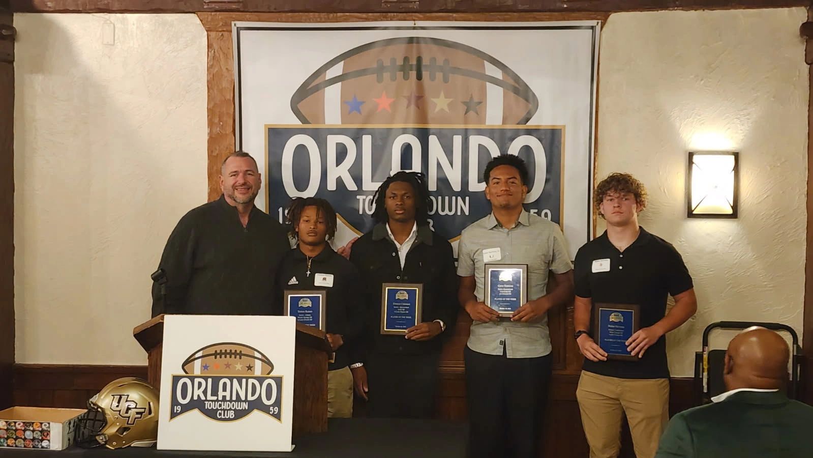 The Orlando Touchdown Club recognizes: Gavin Pritzkau, 8th grade, QB, Central Florida Christian Academy (Varsity); Brock Joyce, Sr, Running Back, Oviedo High School; Zion Matthews, Sr, RB, Dr. Phillips High School; J'len Chaplin, Sr., QB, Seminole High School and Ryder Flynn, Sr, DB, Olympia High School Speaker Ron Zook and HS Coordinator Dan LeForest presented them with plaques to commemorate the occasion.